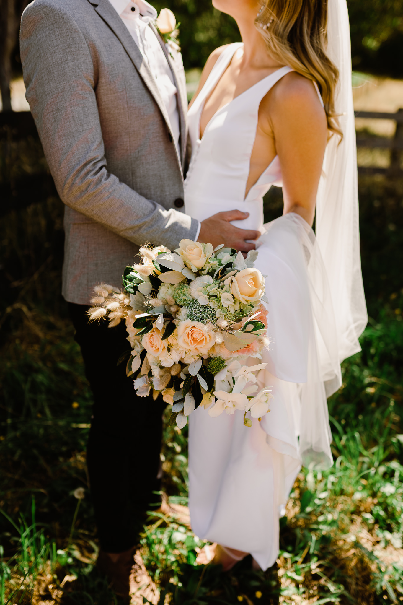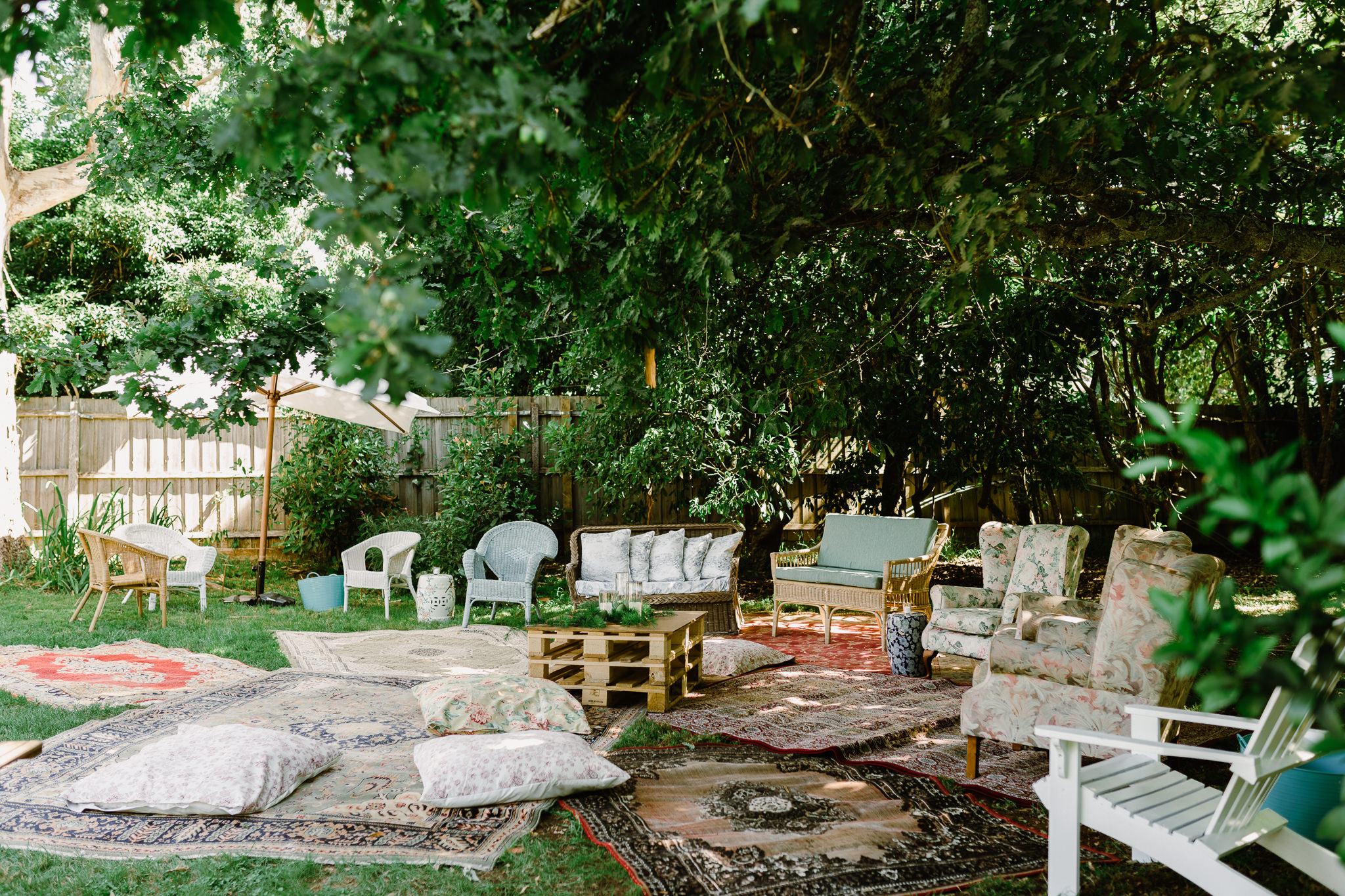 I wanted our wedding to be relaxed and feel like ‘us’, not something super showy or too formal. I knew I wanted festoon lights and long, sharing style tables and this was a good starting point for the styling. I wanted natural colours like wood and whites, lots of the gardens greenery showing, the festoon lights shining under the stars and for everything else to be quite simplistic! We also had a lounge area with lots of comfy cane chairs my mum sourced and layered rugs for people to relax on. The garden was a feature and the open air setting was perfect. I had seen a few weddings at Fig Tree in Byron Bay which stuck with me as styling inspo, but mainly just tried to tune in to what I liked and what fit us as a couple.