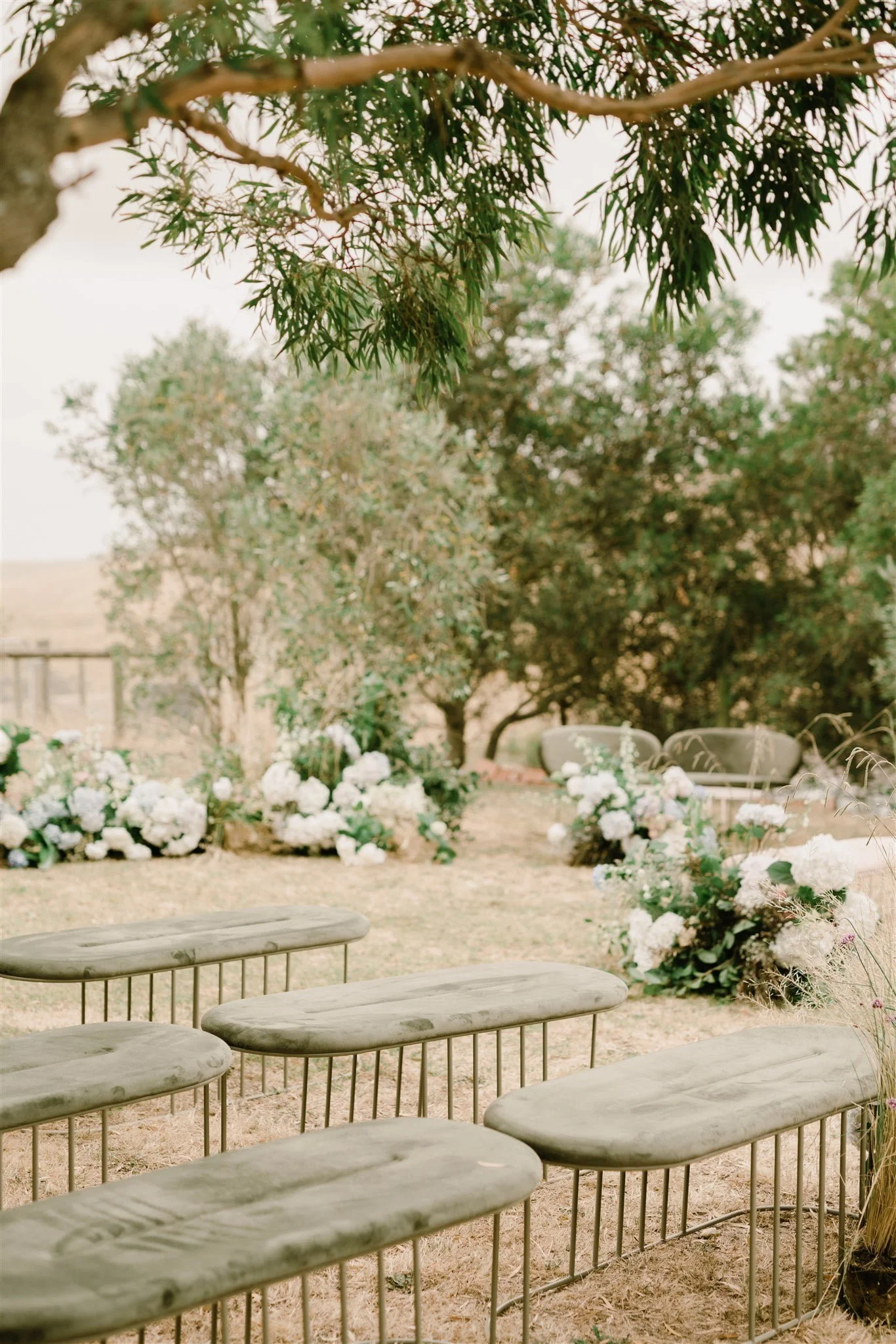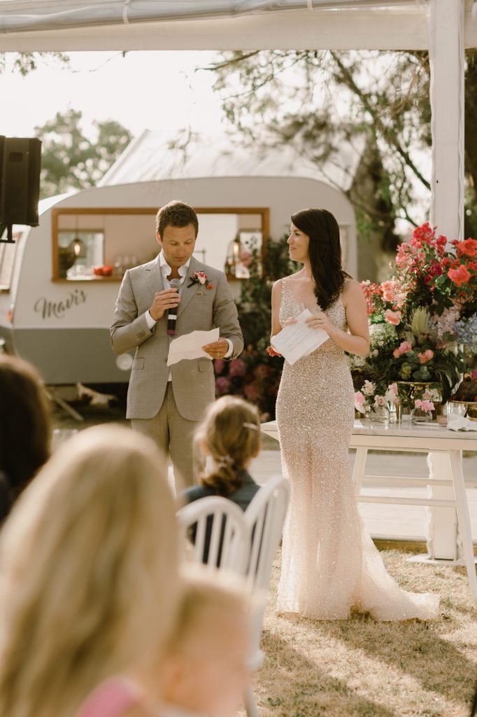 Vendor Details: Photographer Blossom Daisy Creative // Event Planner & Stylist Events By Kate // Florist Cecilia Fox // Stationery & Signage Sketch and Etch // Ceremony & Reception Private Property // Catering MoVida // Marquee EBK Structures // Entertainment Jojo Rainwater (Ceremony) Nicky Bomba (Reception) // Celebrant Pete the Celebrant // Rings Lacy Jewellery // Furniture Harry the Hirer // Caravan Bar Mavis & Lou Lou // THE BRIDE Bridal Gown & Veil Chosen by One Day // Shoes Jimmy Choo // Hair & Makeup Sophia Lambrinakos // Bridesmaid Dresses Marry byTessa Cox Birch // THE GROOM Suit, Shirt & Shoes American Tailors